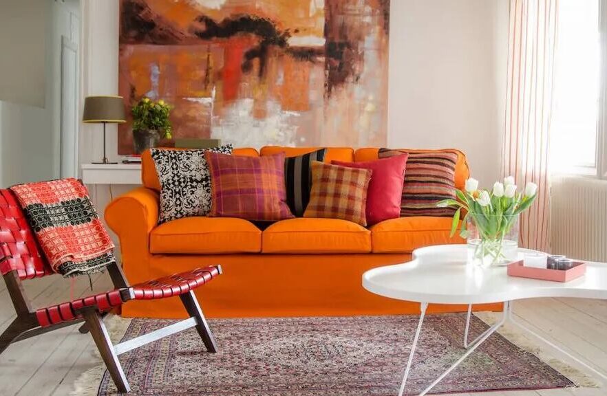 - En una sala de estar, puedes utilizar un sofá azul y combinarlo con cojines y cortinas en tonos naranja.